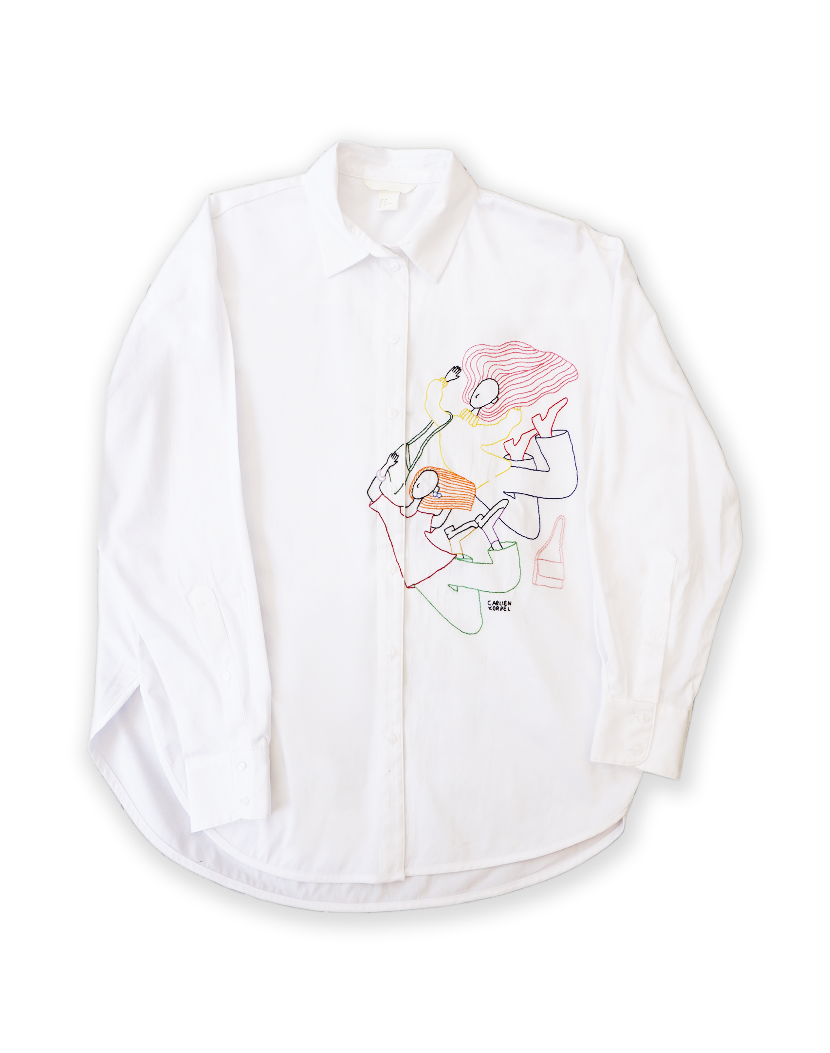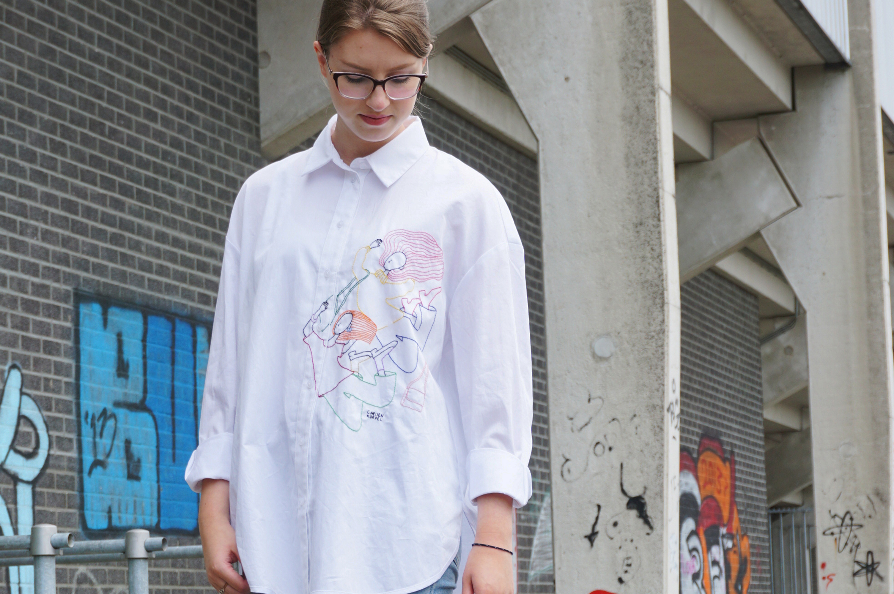 Als afstudeeropdracht voor mijn opleiding Mediavormgeven op het Grafisch Lyceum Rotterdam heb ik een serie van twee geborduurde blousen gemaakt, waaronder deze versie met het borduurwerk van twee vrouwen. Binnen mijn opleiding deed ik de specialisatie Visualiseren, wat betekende dat de focus lag op illustratie. Ik had bij eerdere opdrachten wel eens gebruik gemaakt van borduurwerk als nieuwe techniek en wilde dit bij deze afstudeeropdracht nog verder gaan uitdiepen. Ik wilde mijn illustraties heel graag op een nieuwe, andere manier laten zien.