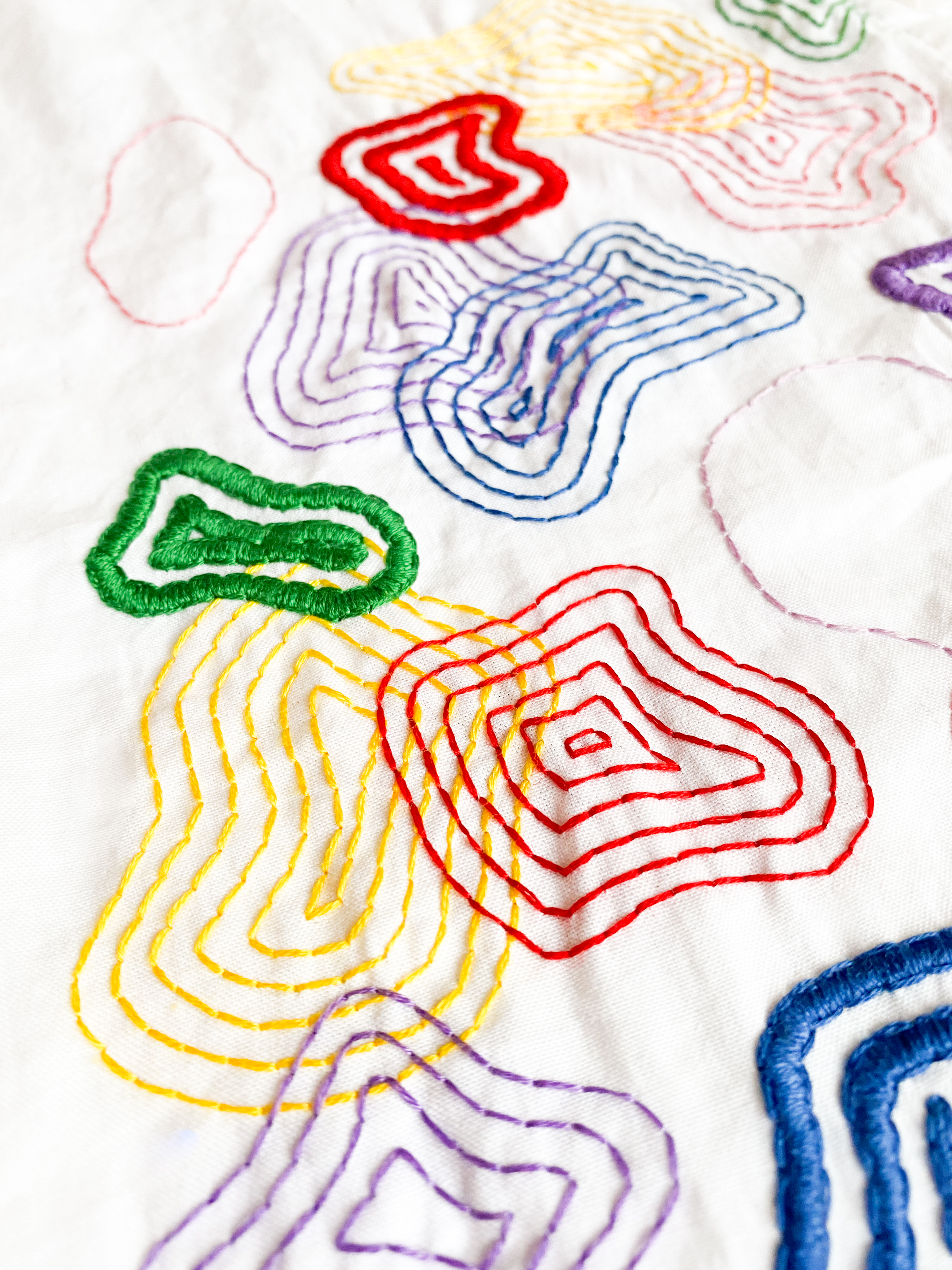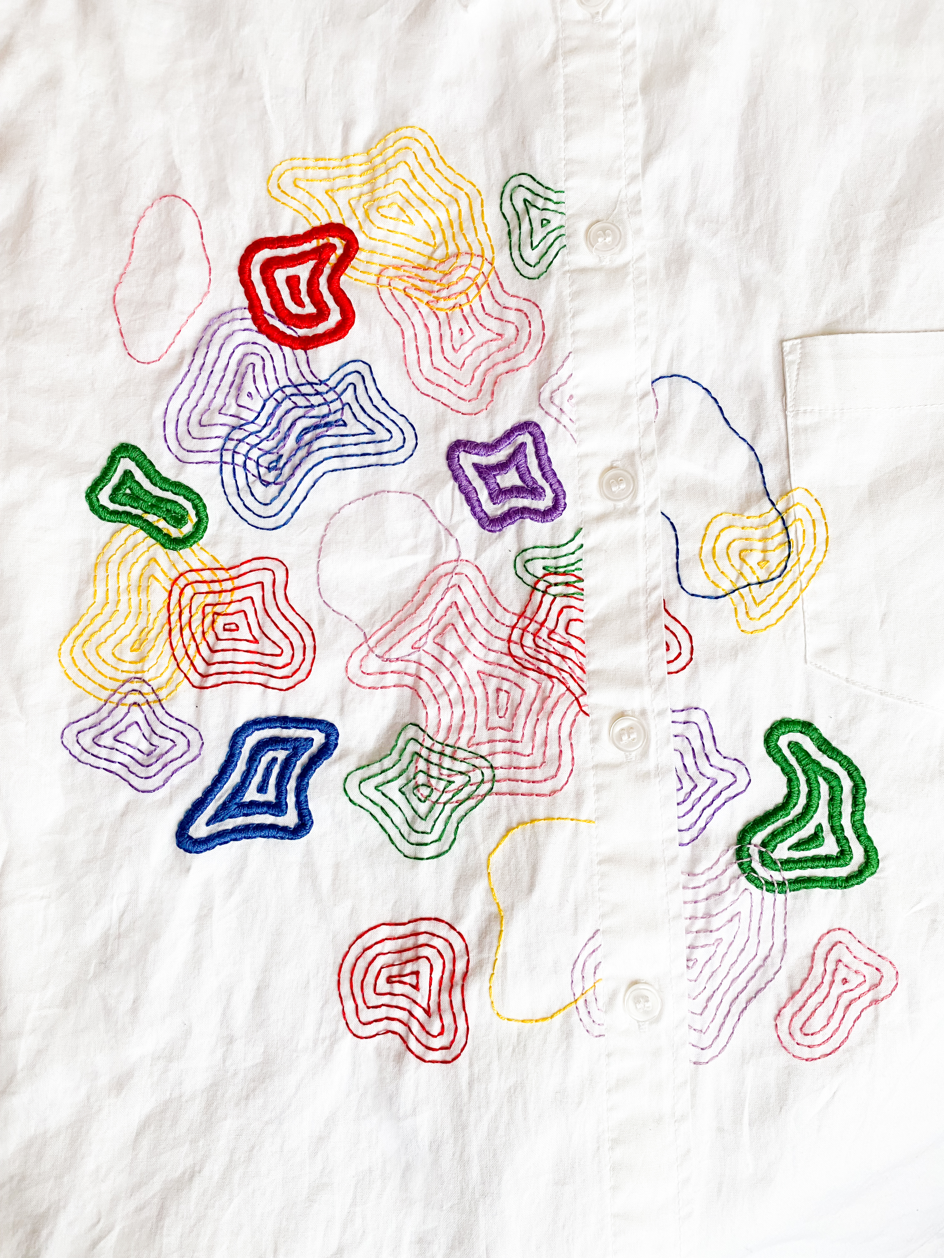 In opdracht voor een enthousiaste collega heb ik deze blouse geborduurd. Ik heb de vormen vrij op de blouse getekend en later digitaal de compositie en kleuren bepaald. Ik was volledig vrij om in mijn eigen stijl de kleuren en vormen te bepalen.