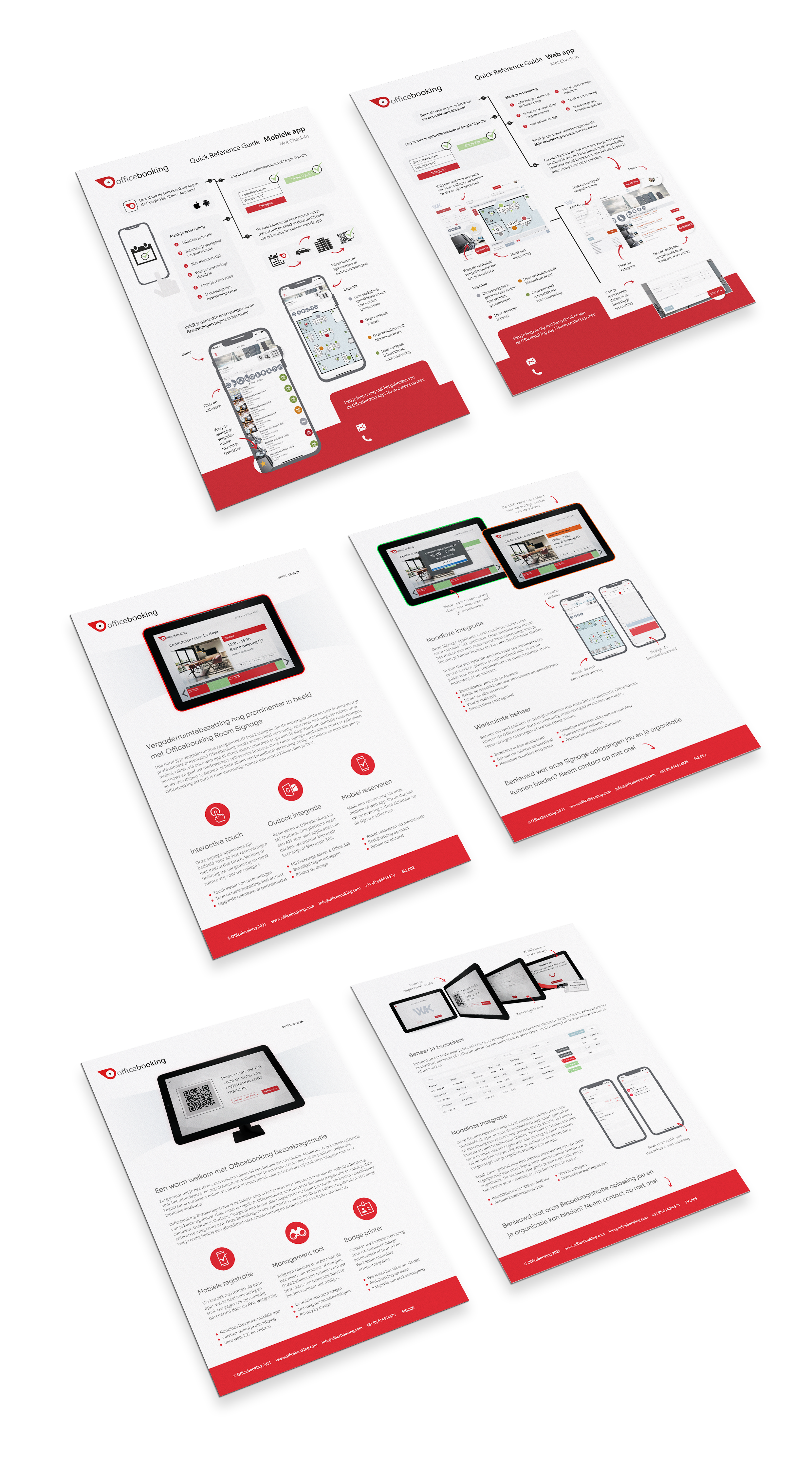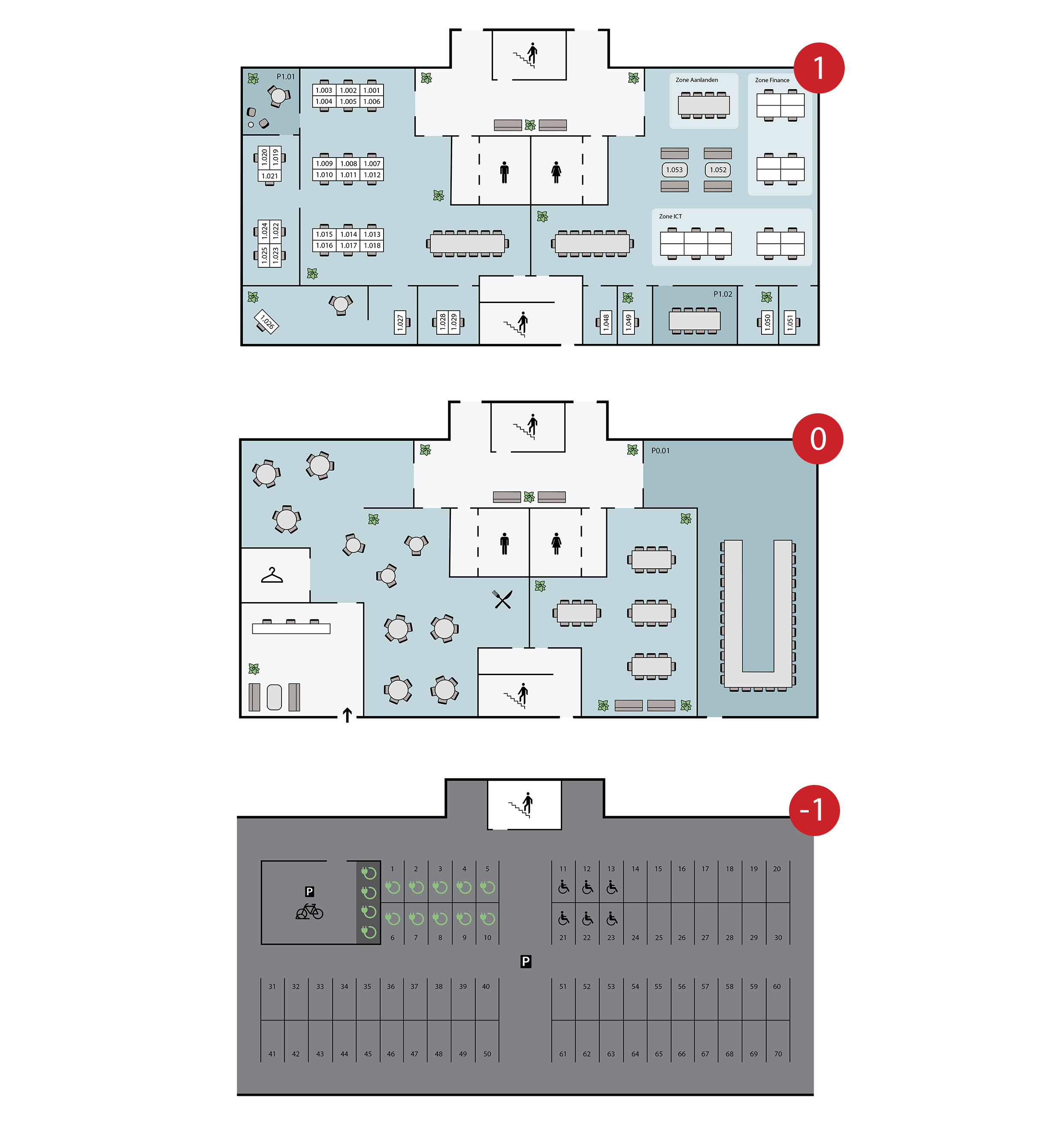 Vanuit mijn achtergrond als technisch DTP’er ben ik daar grotendeels verantwoordelijk geweest voor het tekenen van de plattegronden die zichtbaar waren in de klantomgeving (in de web app en mobiele app). Deze plattegronden gaven de klant een overzichtelijk en universeel beeld van hun verdiepingen en locaties. Ik zorgde dat alle plattegronden binnen alle klantomgevingen een uniforme uitstraling hadden en pasten binnen de richtlijnen van de Officebooking huisstijl.