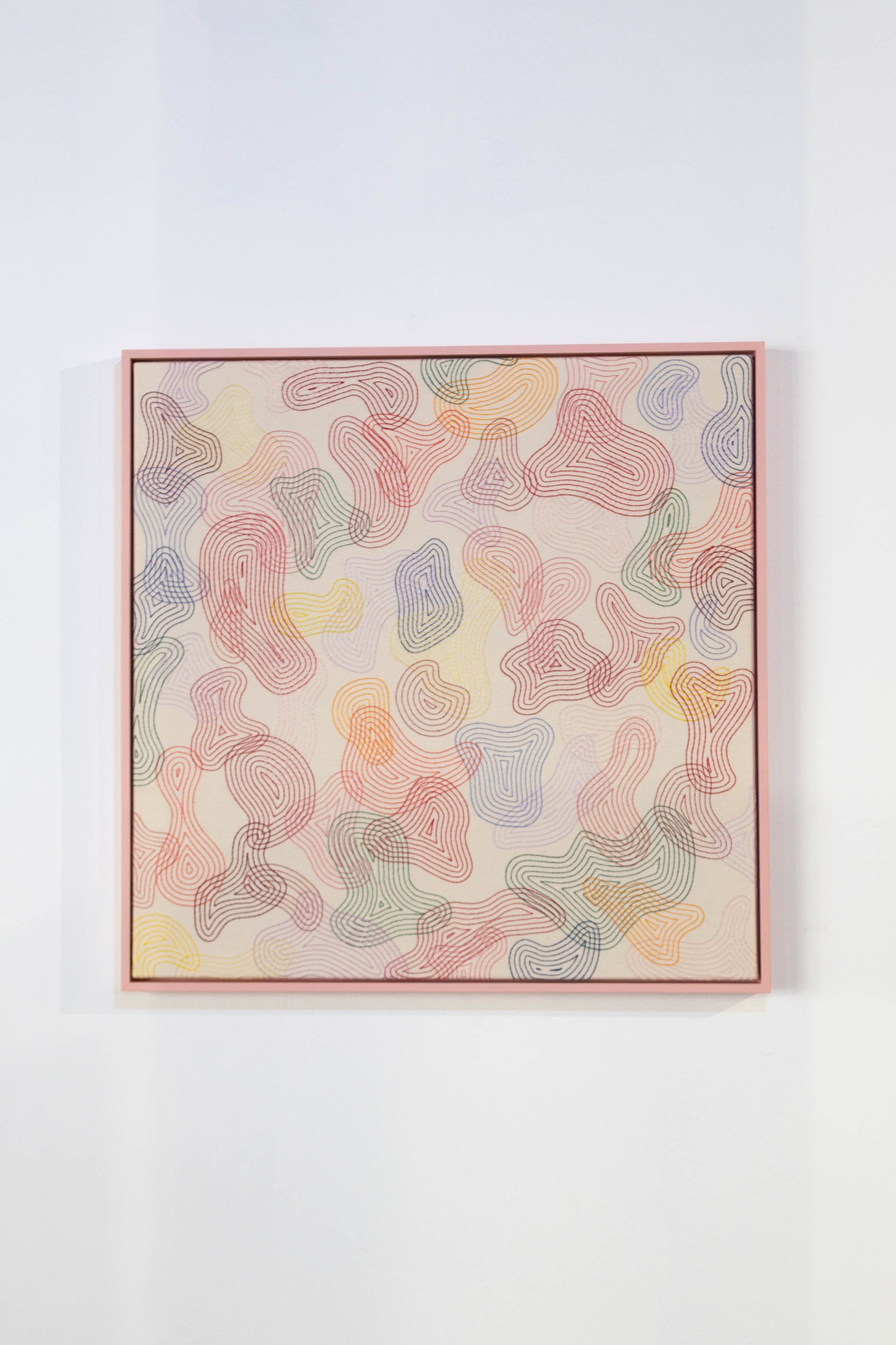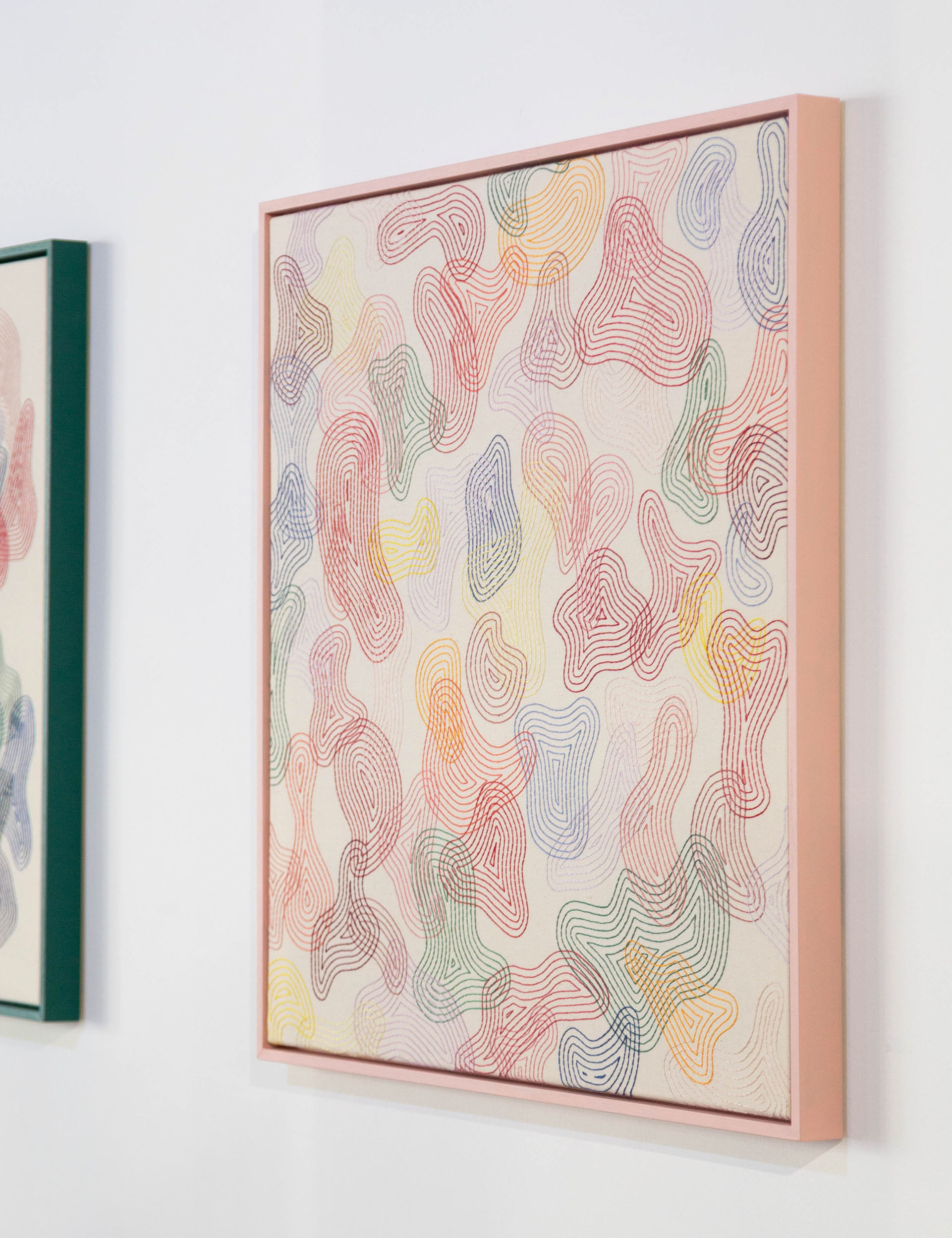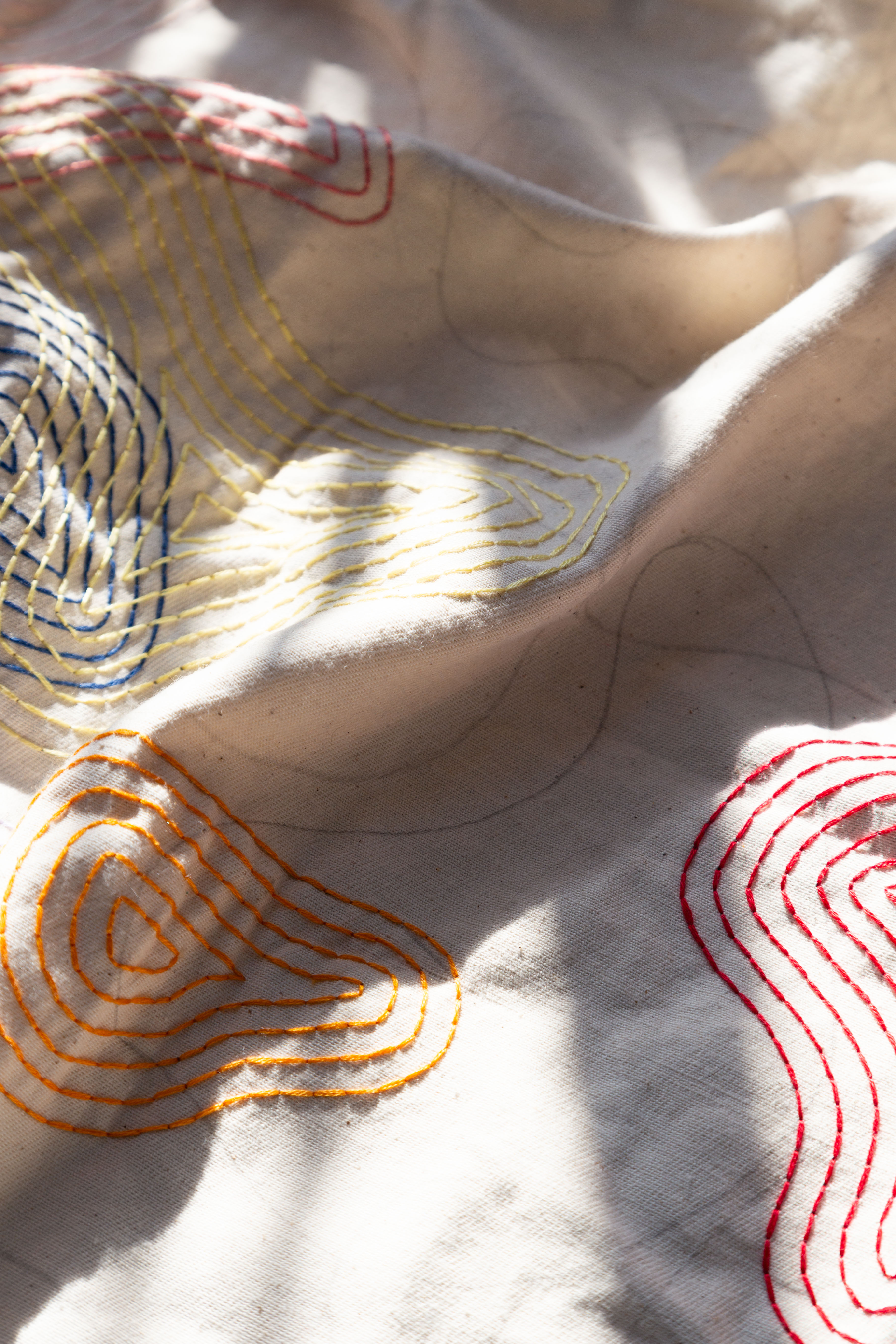 Dit werk is mijn meest recente borduurwerk dat ik ben gestart in maart 2024. Voor dit werk haalde ik opnieuw mijn inspiratie uit bloemen. In dit geval specifiek schilderijen van bloemen. Ik heb hier niet letterlijk de vorm van bloemen gebruikt, maar wel de kleuren die mij ontzettend aanspreken uit de verschillende schilderijen. Ik had zin in een werk wat weer wat meer zomers en energiek aan voelde. Daarbij gebruikte ik voornamelijk de kleuren rood en roze voor een warme boventoon.